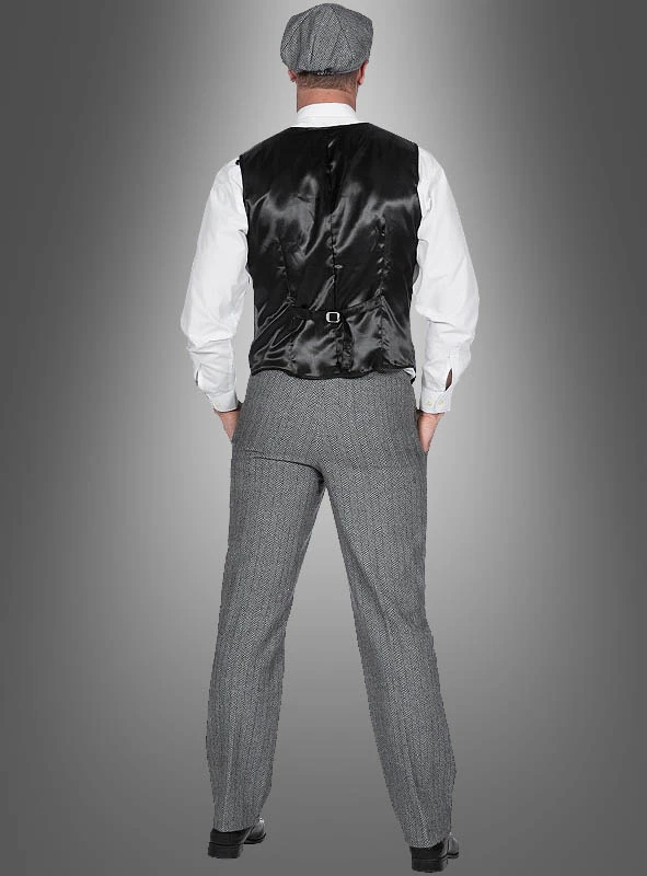 Dieser Herr hier ist zwar nicht Thomas Shelby von den Peaky Blinders, aber er ist zumindest genauso gut gekleidet. Weste, Hose und Schiebermütze im Fischgrät Muster machen dieses 20er Jahre Kostüm für Herren zu einer sehr authentischen Verkleidung – und das in TOP Qualität!