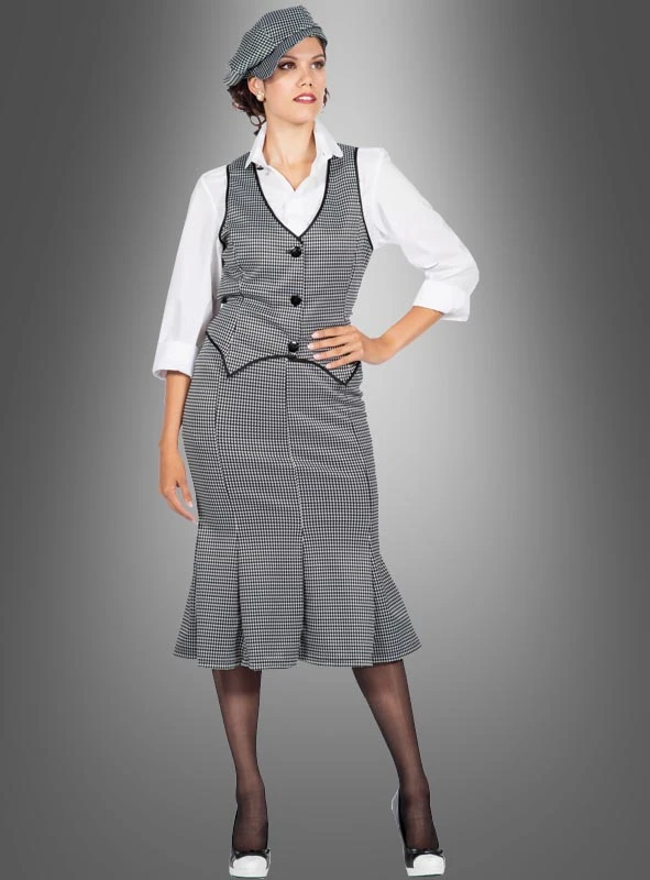 Das 20er Roaring Damenkostüm ist dreiteilig. Der Stoff zeigt das damals angesagte schwarz-weiße Hahnentrittmuster und ist bequem elastisch. So schmiegt sich der figurbetonte Rock perfekt an und macht jede Bewegung mit. Ab oberhalb der Knie bis unten am Saum wird der Glockenrock weiter. Ein Reißverschluss erleichtert das An- und Auskleiden des Rocks.