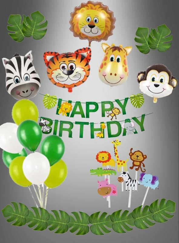 Dieses Zootiere Mottoparty Dekoration Set hat es in sich. 49 Teile bunter Spaß für Kindergeburtstage mit dem Thema Zirkus, Zoo oder Dschungel. Die niedlichen wilden Tiere lächeln die Partygäste an.