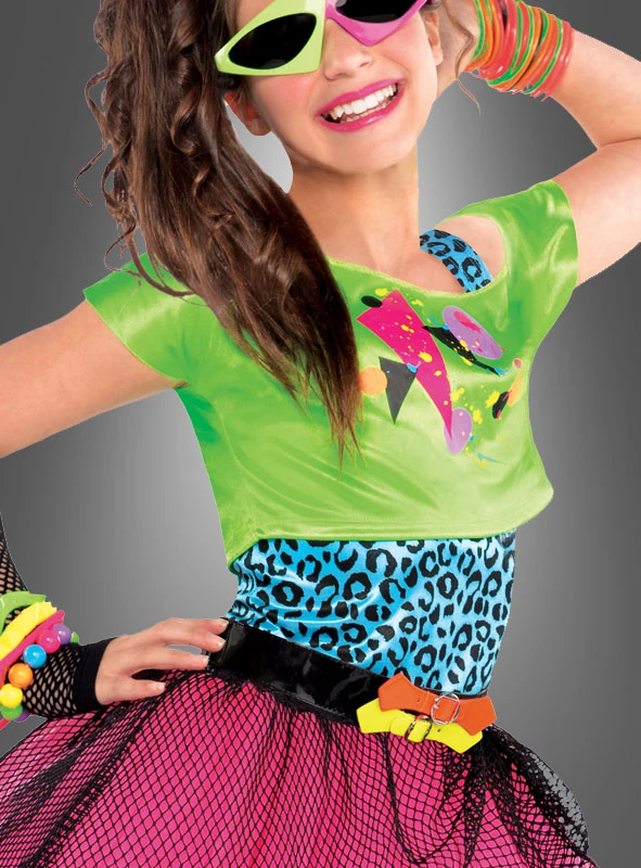 Die 80er Jahre Mode ist auf dem Vormarsch. Mit all den tollen 80er Jahre Partys auch verständlich. Die Musik und die Mode waren einfach toll. Das Kostüm besteht aus einem Kleid mit angenähtem Petticoat in rosa. Schwarzer, grober Netzstoff, drei Lagen leichter rosa Tüll und darunter eine blickdichte Lage Futterstoff in Pink geben dem Rock viel Schwung und tolle Weite. Angenäht ist das ärmellose Oberteil in blau-schwarzem Leoparden-Print. Ein Träger ist aus Leostoff, der andere aus Gummi mit angebrachtem Klettband. Daran wird das grüne Oversize Shirt befestigt. Ein einzelner schwarzer Netzarmstulpe und der schwarze Lack-Gürtel mit den bunten Schnallen sind Highlights des 80er Jahre Teen Kostüms. Mit dabei ist auch die blickdichte Leggings in Lila mit tollem Zebramuster in schwarz.