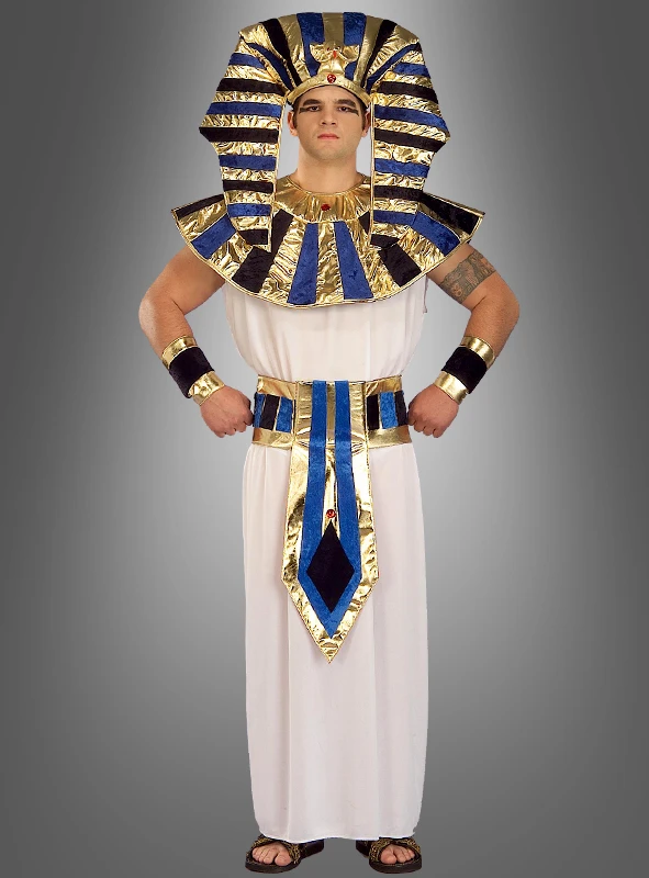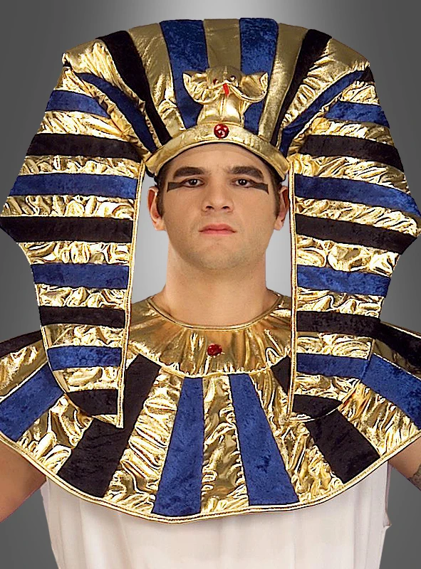 An Prunk und Schätzen ist kaum ein anderer ägyptischer Pharao reicher als Tutanchamun. Das Kostüm besteht aus einem langen, weißen Gewand und viel tollem Zubehör. Der breite Gürtel mit dem Latz vorne ist aus goldenem Lackstoff mit blauen und schwarzen Muster-Elementen genäht. Durch ein Band zum Binden hinten passt der Gürtel und ist sehr flexibel im Umfang. Auch der breite, runde Kragen und die Pharaonen Kopfbedeckung sind im gleichen Stil gefertigt. Das Kopfteil wird wie ein Hut getragen und ist sehr bequem. Mit dabei sind auch die beiden Armstulpen. Durch den glänzenden, goldenen Stoff sieht das Pharaokostüm sehr edel aus.