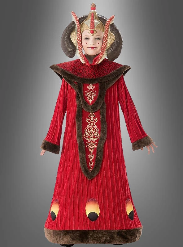 Die Deluxe Version vom Amidala Kostüm für Kinder ist aus rotem Samtstoff mit abgenähten Biesen gefertigt. Auch hier sind die Säume mit Kunstfell abgesetzt. Auch der Schulterkragen und die angenähten Zierschürzen sind mit Kunstfell versäubert. Die Ranken sind hier mit goldenem Faden aufgestickt. Die ovalen Zieraugen unten am Kleid sind aufgenäht und wattiert. Ein integrierter Rockreif im Saum sorgt für eine schöne Weite des Kostüms.