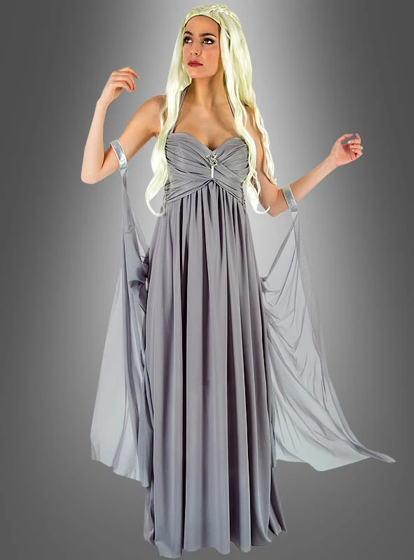 Die Schleiertücher sind seitlich angenäht und werden mit silbernen Gummibändern an den Armen befestigt. Das gibt dem Fantasy Kostüm einen wunderbar leichten Look. Beschwingt können Sie damit Gäste empfangen oder auf den Terrassen des Palasts den Flug der Drachen beobachten.