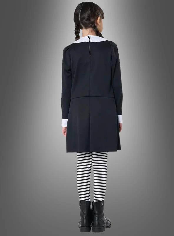 Ein dunkles Gothic Mädchen trägt als Kostüm am liebsten schwarz-weiße Kleidung. Hier ist es ein klassisches schwarzes Kleid mit weißem Kragen und Ärmel-Manschetten. Besonders schön sind die Totenkopf Zierknöpfe am Kleid. Passend dazu ist die schwarz-weiße Ringel-Leggings mit dabei.