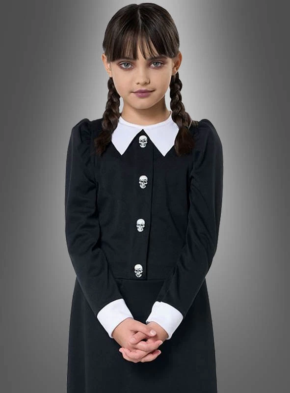 Als dunkles Gothic Mädchen im Kostüm für Kinder sieht ihr kleines Kind aus wie die beste Freundin von Wednesday. Als Fan der Addams Family möchte man natürlich genau so cool und schön sein. Mit diesem Kinderkostüm wird dieser Traum jetzt wahr.