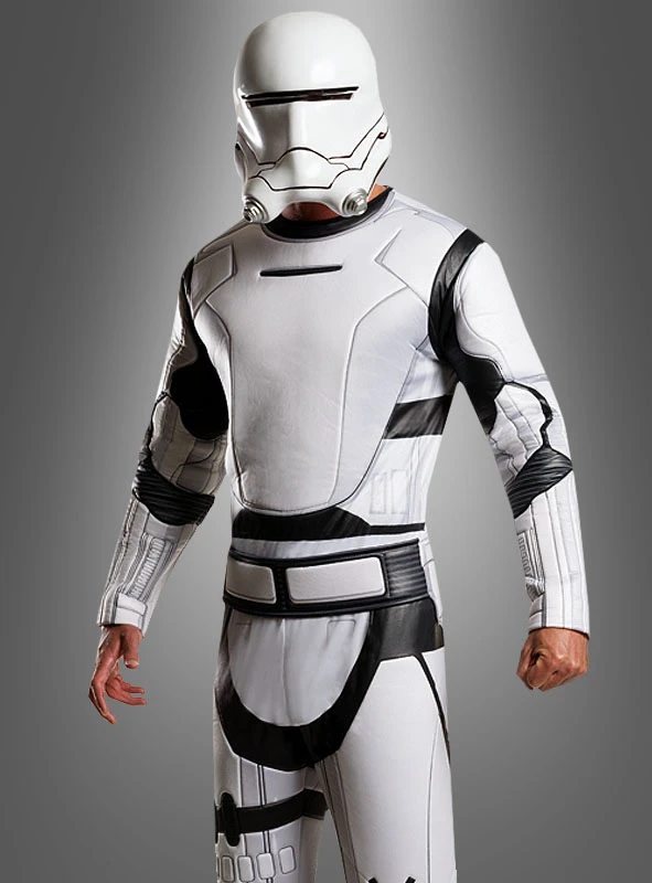 Der zweiteilige Flametrooper Helm wird durch einen Klettverschluss zusammengesteckt. Er ist aus stabilem Kunststoff gefertigt und sehr detailgetreu gearbeitet. Der Gürtel ist aus weich wattiertem bedrucktem Stoff mit Klettverschluss im Rücken genäht. Auch hier sind Einzelheiten der Rüstung abgenäht.