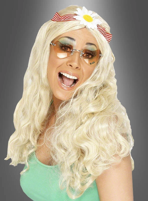 Als Hippiefrau tragen Sie die Frisur natürlich lang. Die blonde Flower Power Perücke für Damen passt perfekt zum Hippie Style. Das angebrachte Haarband mit der schönen großen Blume sagt alles aus. Hier tanzt ein Blumenkind für den Weltfrieden!