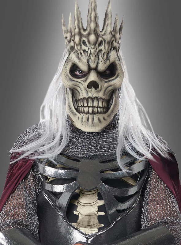 Das Highlight ist sicherlich die Halbmaske. Sie zeigt den Skelett Schädel mit der Knochenkrone und ist fantastisch detailliert gestaltet. Seitlich sind noch graue Haare angebracht, die dem König der Untoten ein weises Aussehen geben. Die Halbmaske aus Latex ist innen im Stirn- und Nasenbereich gepolstert und wird mit einem Gummiband um den Kopf gehalten. Der Hinterkopf bleibt hier frei.