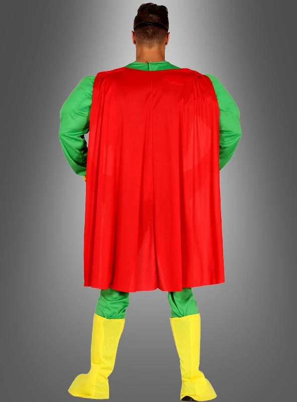 Um sich in den tapferen und dauerbekifften Haschman zu verwandeln, ziehen Sie einfach den grünen Overall über. Die Hosenpartie in dunkelgrün ist integriert und kein zusätzliches Teil. Im Brustbereich und an den Oberarmen ist der Overall wattiert, um die Muskeln schön auszupolstern. Auf der Brust prangt Haschmans Logo: ein typisches Hanfblatt. Um das rote Cape am Kostüm zu befestigen, sind an den Schultern Klettbänder angebracht.