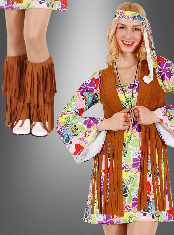 Die coole braune Fransenweste und die passenden Stulpen sind die ideale Ergänzung für jedes Flower Power Hippie Kostüm. Sie passen zu vielen verschiedenen Kleidern aus der Zeit der 60er und 70er Jahre. Wenn Sie noch Kleidung aus dieser Zeit haben, lässt sich im Handumdrehen ein tolles Hippie Kostüm aus dem Fransenset zaubern.