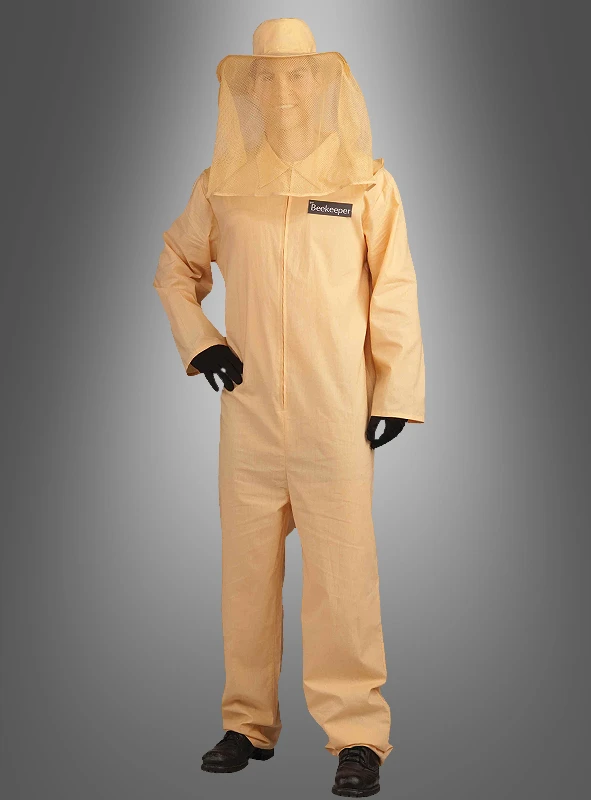 Das Imkerkostüm besteht aus einem beigefarbenen Overall mit Aufdruck „The Beekeeper“ und einem Imkerhut mit angenähtem Netz. Reißverschluss vorne für bequemes An- und Ausziehen. Der Stoff ist angenehm zu tragen, aber nicht dehnbar. Bitte die Maßangaben beachten. Durch den hohen Baumwollanteil ist dieses Kostüm sehr angenehm zu tragen.