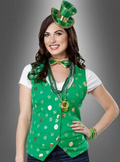 Etwas Grünes zu tragen ist Pflicht am St. Patricks Day. Und am liebsten mit Kleeblättern verziert. Das irische Damen Kostüm Set beinhaltet die schöne grüne Weste, die mit goldglänzenden Münzen und grünen Kleeblättern bedruckt. Die Weste kann geknöpft werden, ist aber auch offen tragbar. Der schöne Mini Zylinder am Haarreif und die Fliege sind ebenfalls grün und mit goldenem Glanzstoff eingefasst. Der Stoff hier ist in verschiedenen Grüntönen kariert gemustert. Mit dabei sind auch zwei grüne Haarsträhnen mit glitzernden Flitterhaaren, die mit einem kleinen Haarkamm in der Frisur befestigt werden kann.