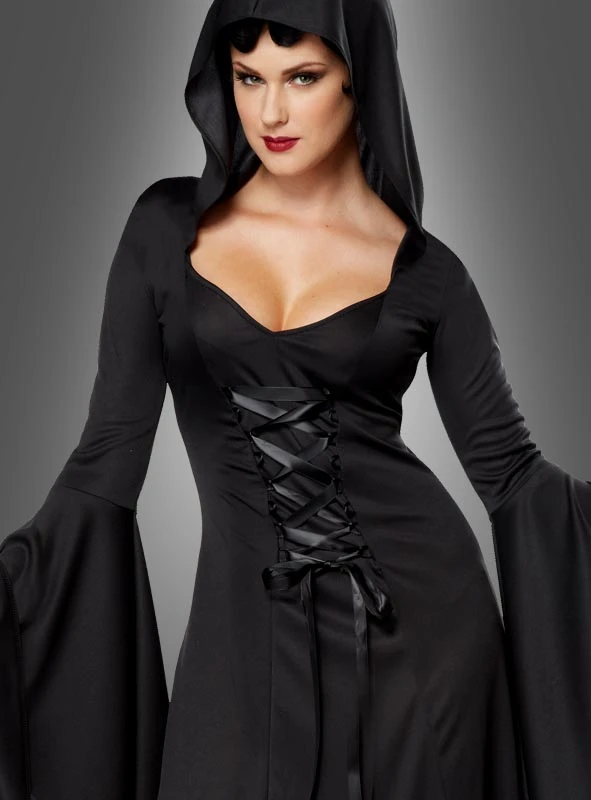 Dunkel wie die Nacht mit schwarzen Schwingen… mit diesem schwarzen Kapuzenkleid werden Sie zur wahren Verwandlungskünstlerin, denn mit diesem Kostüm können Sie viele verschiedene Charaktere darstellen.