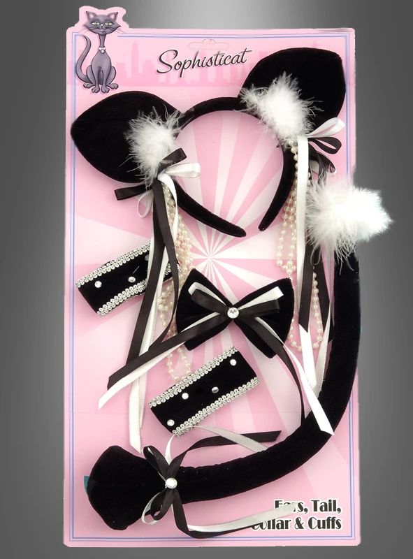 Katzenkostümset für Erwachsene. Haarreif mit befestigten Katzenohren, Schwanz, Schleife und Halsband für einen sexy Katzenlook.