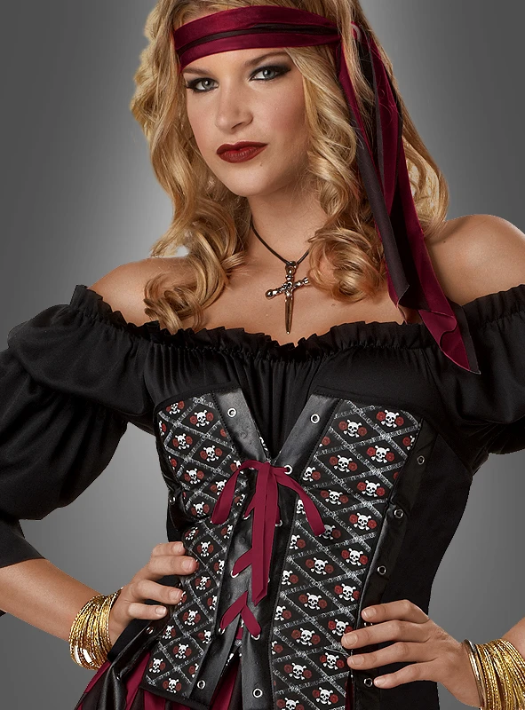 Die Seeräuberin trägt eines der schönsten Piratenkostüme für Damen. Ein tolles Kleid, bei dem die Rocklänge beliebig variiert werden kann. Die schwarze Carmenbluse hat am Ausschnitt einen Gummizug, so dass die auch schulterfrei getragen werden kann. Darüber trägt die Piratin eine tolle Korsage mit aufgedruckten Totenköpfen und sexy Schnürung vorne. Das Haarband passend zum Kleid ist ebenfalls im Lieferumfang enthalten.