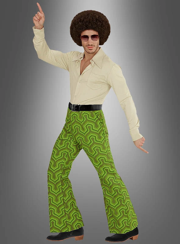 Die 70er Hose für Herren sorgt auf jeder Disco- und Schlagerparty für Aufsehen. Mit ihrem Retromuster in verschiedenen Grüntönen fallen Sie auf jeden Fall auf. Jetzt noch ein passendes, schrilles Oberteil dazu tragen und das Outfit ist perfekt.