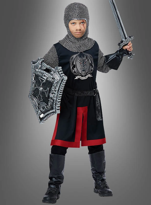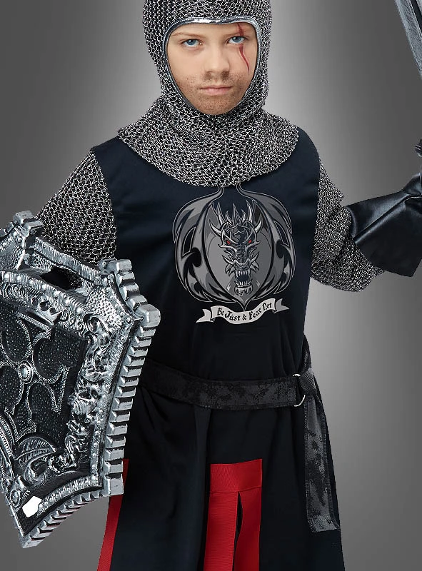 Das Ritter Kinderkostüm besteht aus einer schwarzen Tunika mit Ärmeln im Kettenhemddesign. Auf der Brust ist ein Drachenwappen angebracht. Der Saum des Wappenrocks ist in Rot gehalten. Ein schöner Kontrast zur dunklen Tunika.