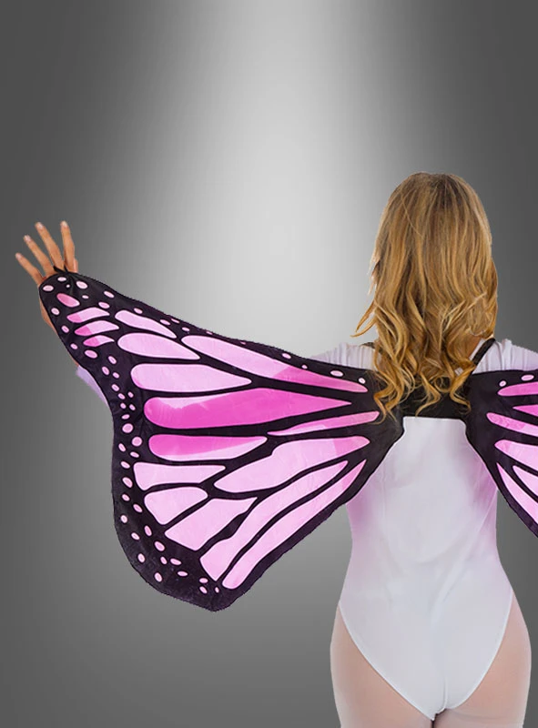Zusätzliche Schlaufen sind vorhanden für die Mittelfinger. Mit jeder Hand- bzw. Armbewegung schwingen die Flügel mit. Spannweite der Flügel ca. 170 cm. Riesig! Damit kann man elfengleich über die Tanzfläche schweben. Die rosa Schmetterlingsflügel sind, wie auf dem Bild zu sehen ist etwas kleiner. Die Spannweite ist jedoch auch ca. 170 cm. Für Erwachsene eine zauberhafte Kostümidee. Kleinere Größen für Kinder haben wir auch im Programm.