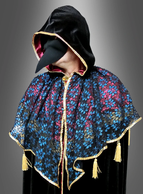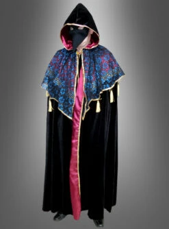 Edler Umhang aus Samt in schwarz mit rotem Satin Innenfutter. Angenähter, aufwändig gearbeiteter Schulterumhang mit Kapuze verziert mit goldenen Quasten und bezogen mit Spitzenstoff. Schmuckbrosche zum Schließen. Schwere Theaterqualität in Deluxe Ausführung.