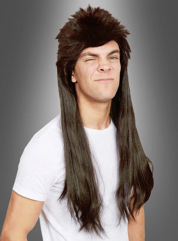 Vorne kurz, hinten lang – oder abgekürzt Vokuhila – ist die typische 80er Jahre Frisur. Mit dieser Vokuhila Perücke in braun brauchen Sie sich nicht erst die Haare wachsen lassen, zumal diese Frisur nun wirklich nicht mehr zeitgemäß ist. Im Handumdrehen sind Sie perfekt gestylt für eine 80er Jahre Mottoparty und haben lange Haare wie nie zuvor, die Sie auch mal über die Schulter werfen können.