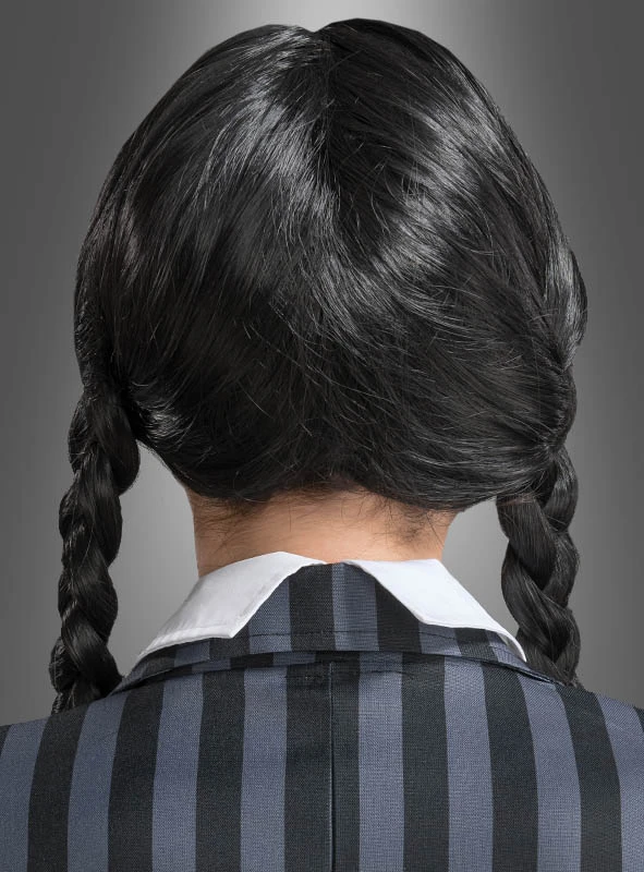 Das Kostüm der Addams Family Tochter wäre nicht perfekt ohne die Wednesday Perücke für Kinder mit langen Zöpfen. Mit diesem Accessoire zum Kostüm wird man sofort als die düstere Wednesday erkannt.