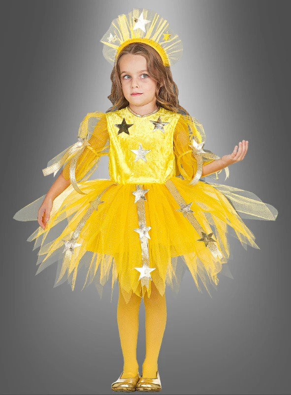 Süßes Sternkind Weihnachtskostüm für Kinder mit Sternen-Haarreif. Aufwendiges Tüllkleid mit Reißverschluss am Rücken. Das Rockteil besteht aus einem Unterrock und zwei Lagen Tüll mit glitzernden Effekten. Ein tolles Kostüm mit goldenen Sternen und wunderschönen Verzierungen.