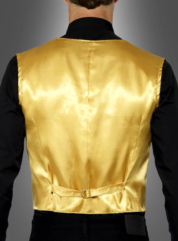 Die Weste ist auf der Vorderseite mit aufgenähten Pailletten verziert. Auf der Rückseite ist der gold-gelbe Satinstoff mit feinem Glanz zu sehen. Sie kann vorne geknöpft werden. Im Rückenbereich ist ein Riegel angebracht, zwei Satinbänder mit denen man die Weite regulieren kann. Tragen Sie am besten schwarze Kleidung, damit das schimmernde Gold gut zur Geltung kommt.