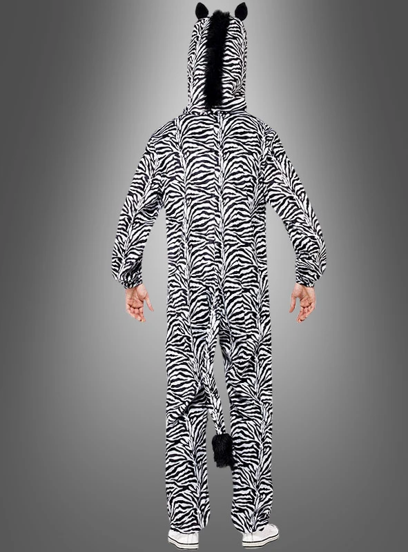 Das Zebrakostüm besteht aus einem weichen Overall aus Samtstoff mit angenähtem Schwanz. Ärmel- und Beinabschlüsse sind mit einem Gummizug versehen. Auf der Vorderseite befindet sich ein Reißverschluss, was den Gang zur Toilette vereinfacht.